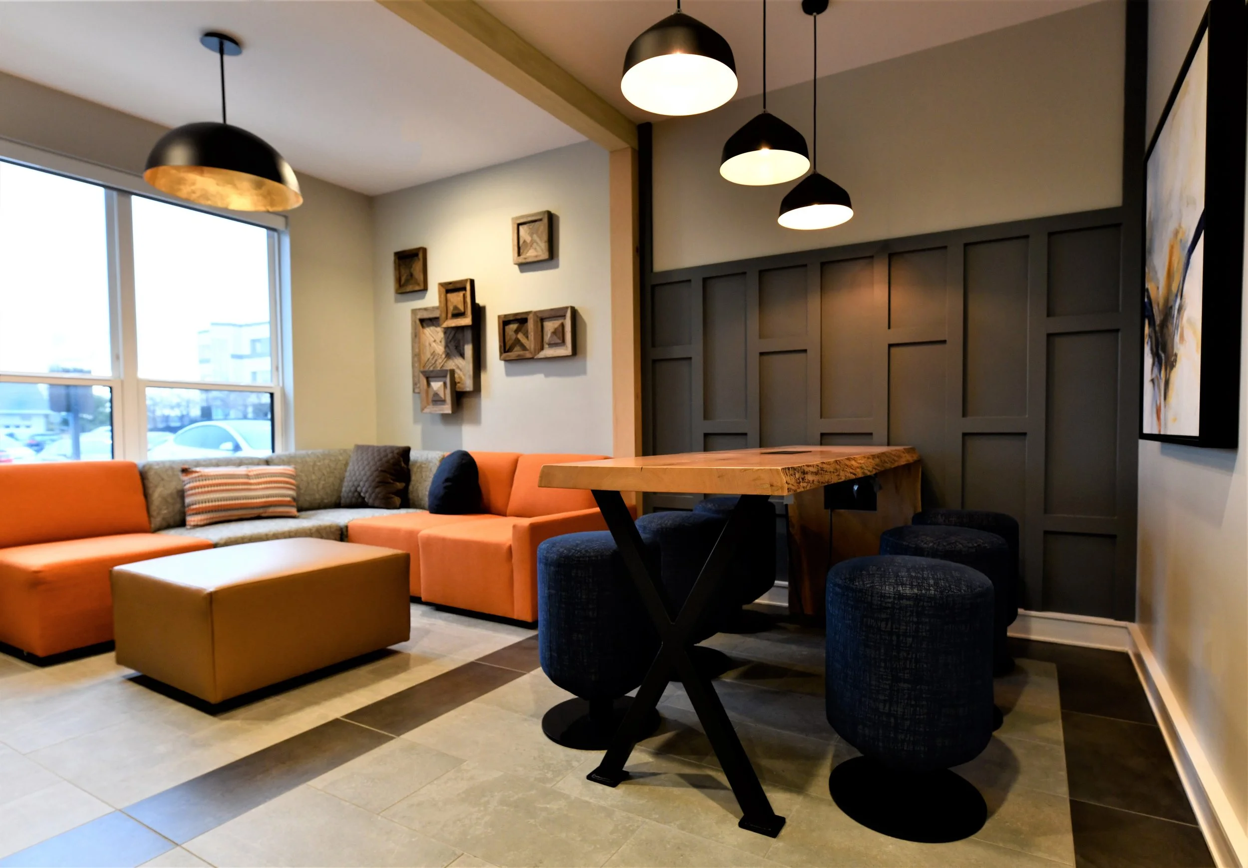 The central lobby serves as both a leasing waiting area and a "living room" with a roaring fire. Modern lighting and custom-built furniture blend with the farmhouse aesthetic, while real rock veneer, faux beams, and flagstone-look flooring enhance the rustic charm with contemporary functionality.